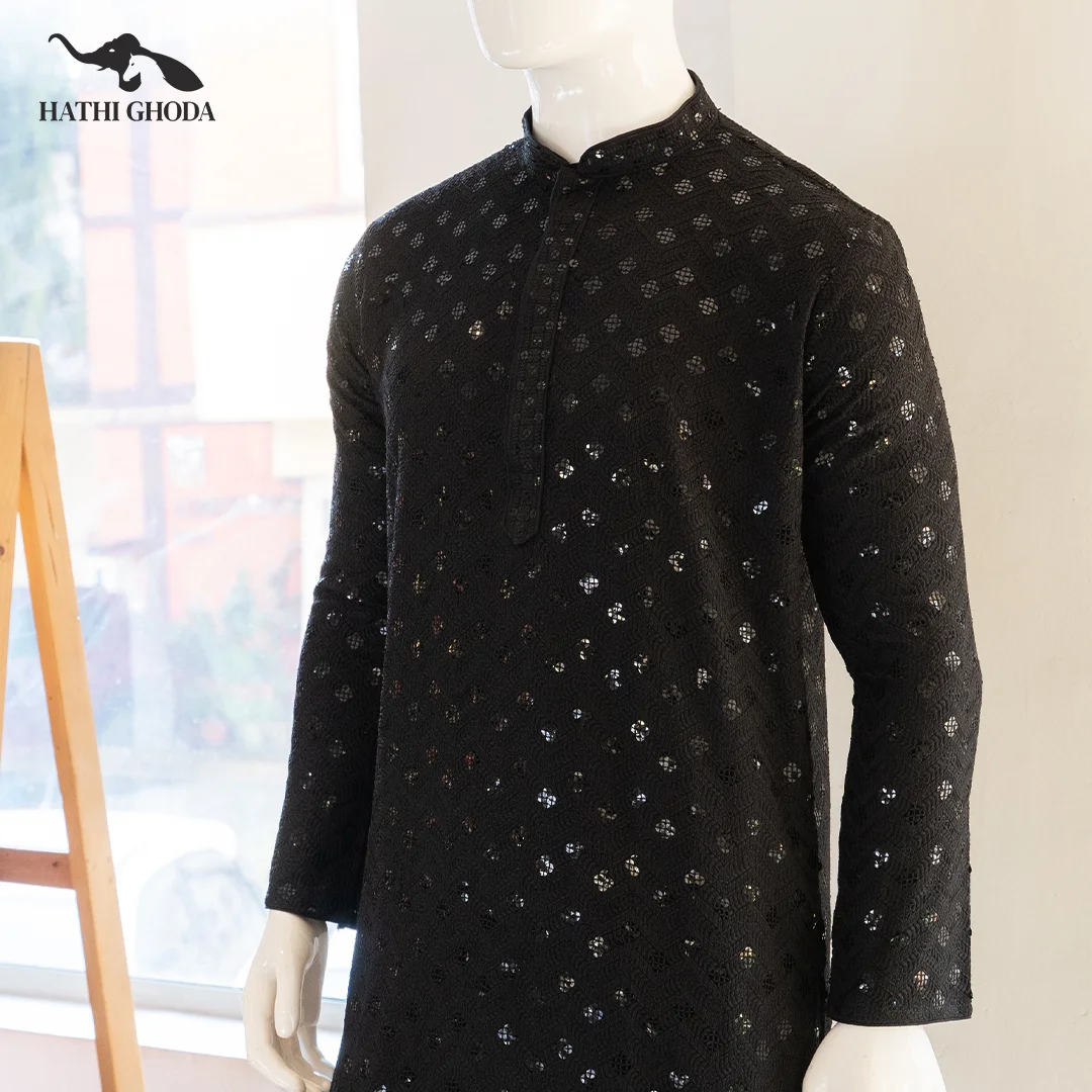 Immerse yourself in festive celebrations with our Black color Kurta Pajama set, featuring detailed machine-woven threadwork, and delicate sequin work on cotton fabric.