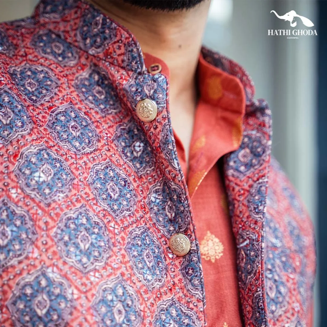 This maroon jacket is made from blended cotton fabric with machine net work throughout. The touch of a golden button and mandarin collar will instantly elevate your look.