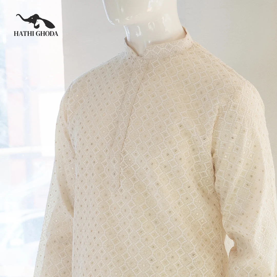 Immerse yourself in festive celebrations with our off-white color Kurta Pajama set, featuring detailed machine-woven threadwork, and delicate sequin work on cotton fabric.