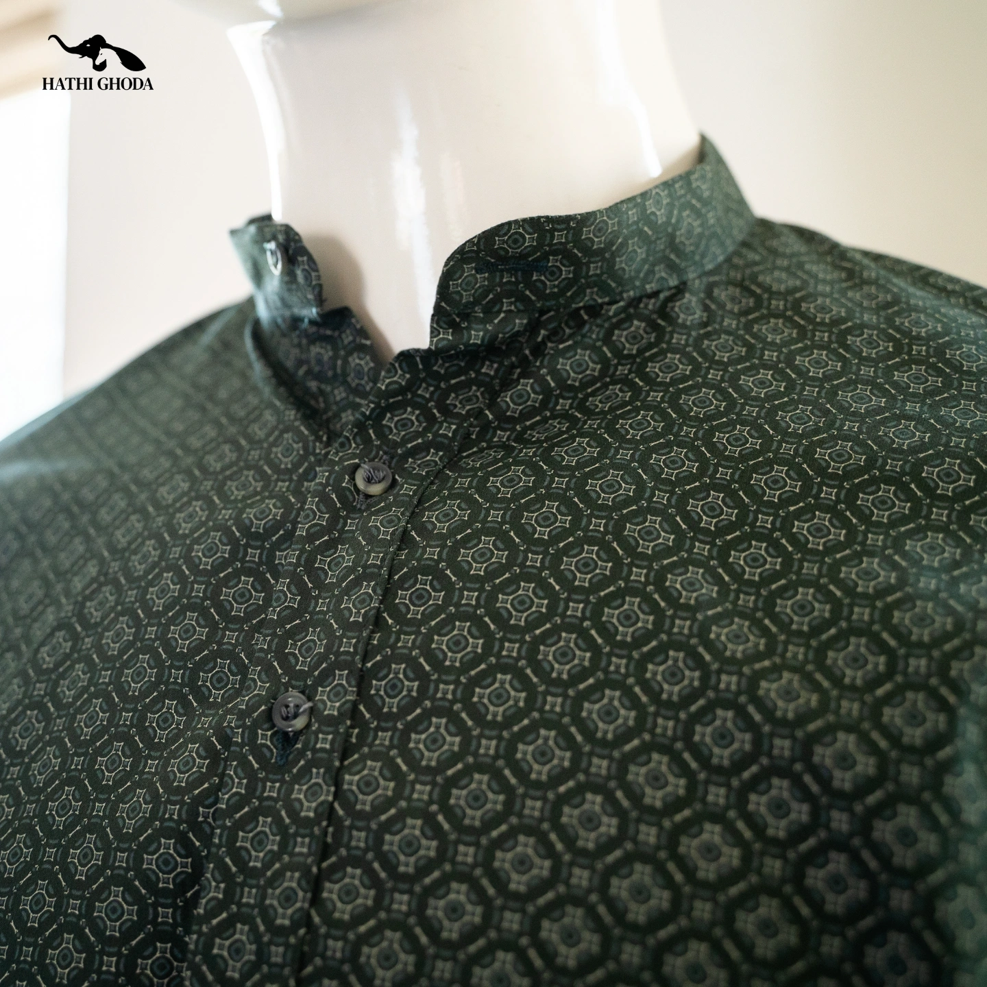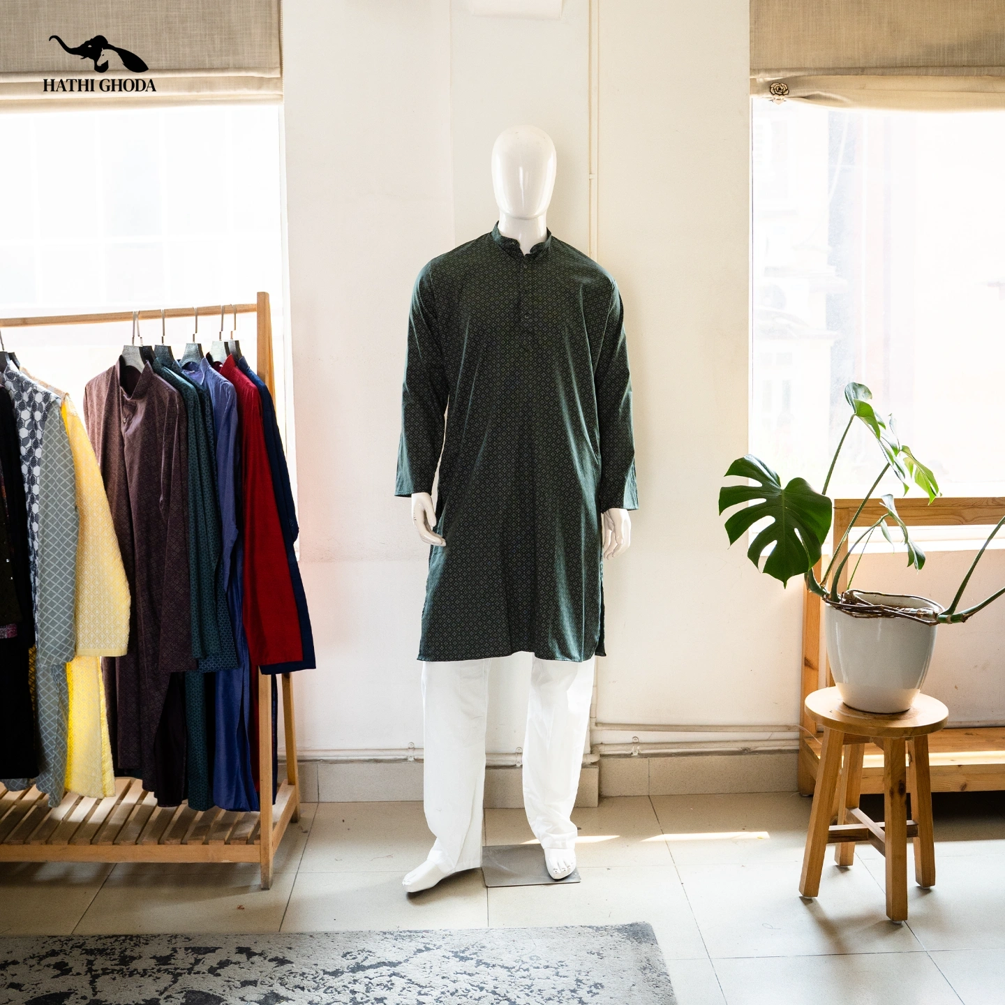 Immerse yourself in festive celebrations with our forest green color Kurta Pajama set, featuring detailed digital prints and delicate blended cotton fabric.