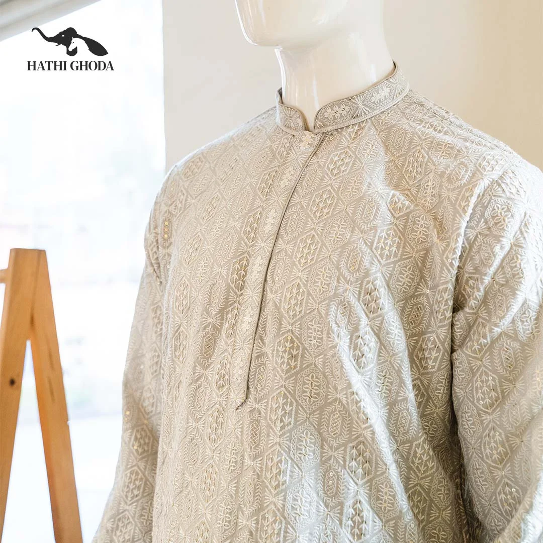 Immerse yourself in festive celebrations with our silver color Kurta Pajama set, featuring detailed machine-woven threadwork, and delicate sequin work on cotton fabric.