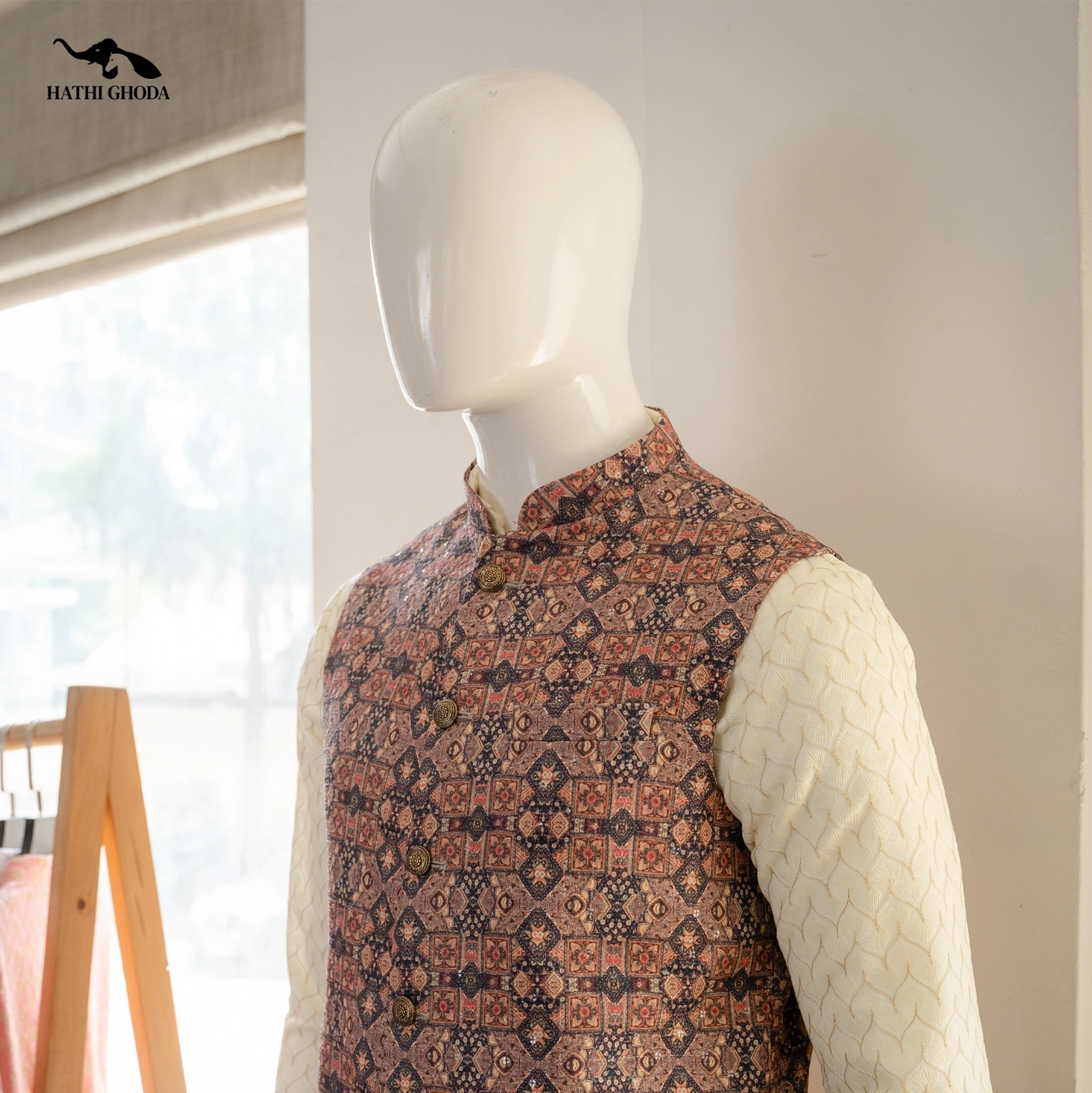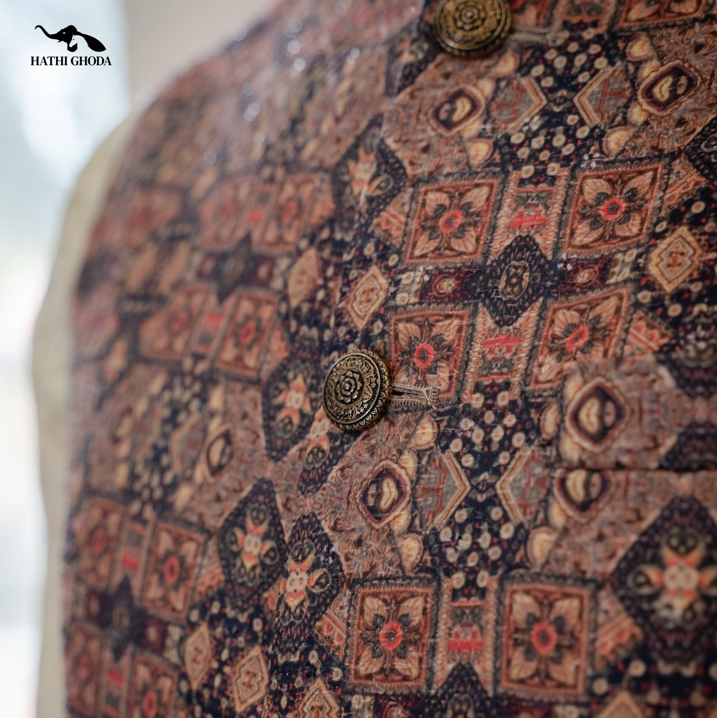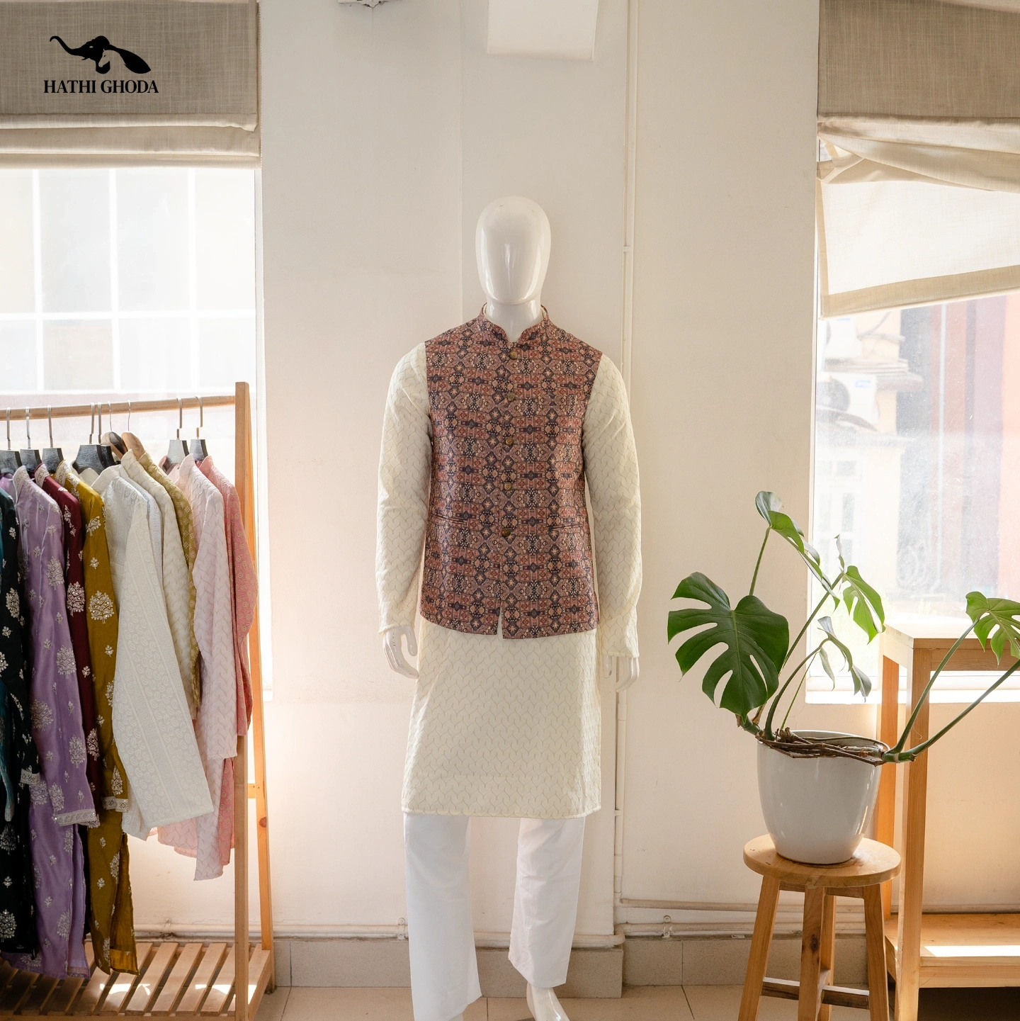 Our Luni Print chikankari waistcoat is the perfect add-on to your kurtas! Perfect for weddings, festive celebrations, and the happiest moments of your life.