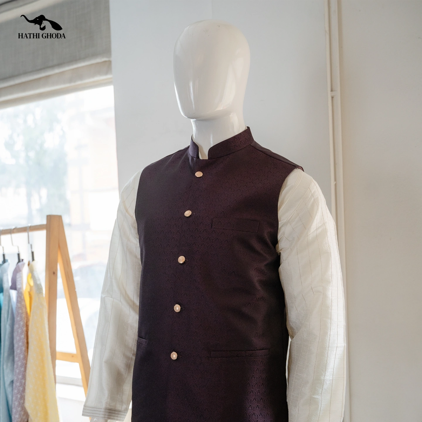 Our Magenta Shine brocade jacquard waistcoat is the perfect add-on to your kurtas! Perfect for weddings, festive celebrations, and the happiest moments of your life.