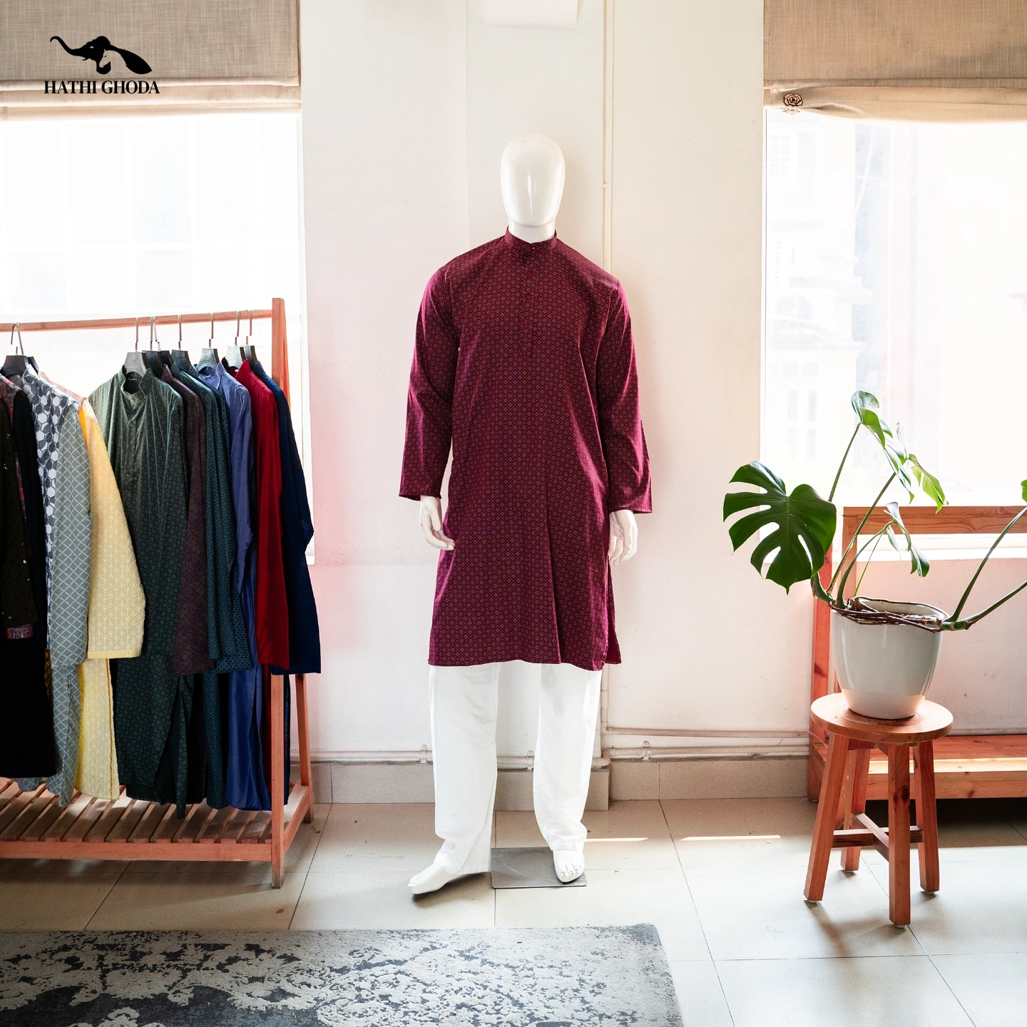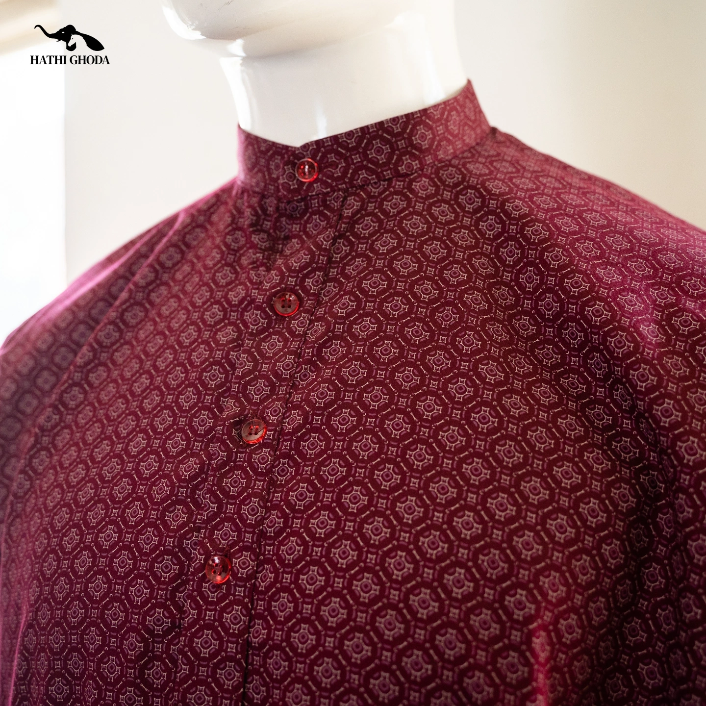 Immerse yourself in festive celebrations with our maroon redish color Kurta Pajama set, featuring detailed digital prints and delicate blended cotton fabric.