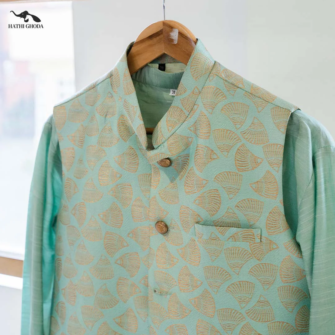 This waist coat is made from Canvas fabric with floral prints throughout. The touch of a golden button and mandarin collar will instantly elevate your look.